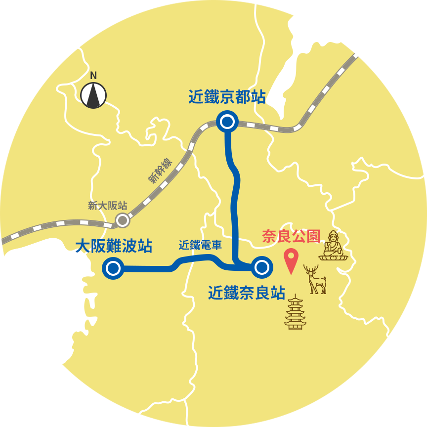 近鐵電車從大阪(難波)、京都直達近鐵奈良站,非常方便。