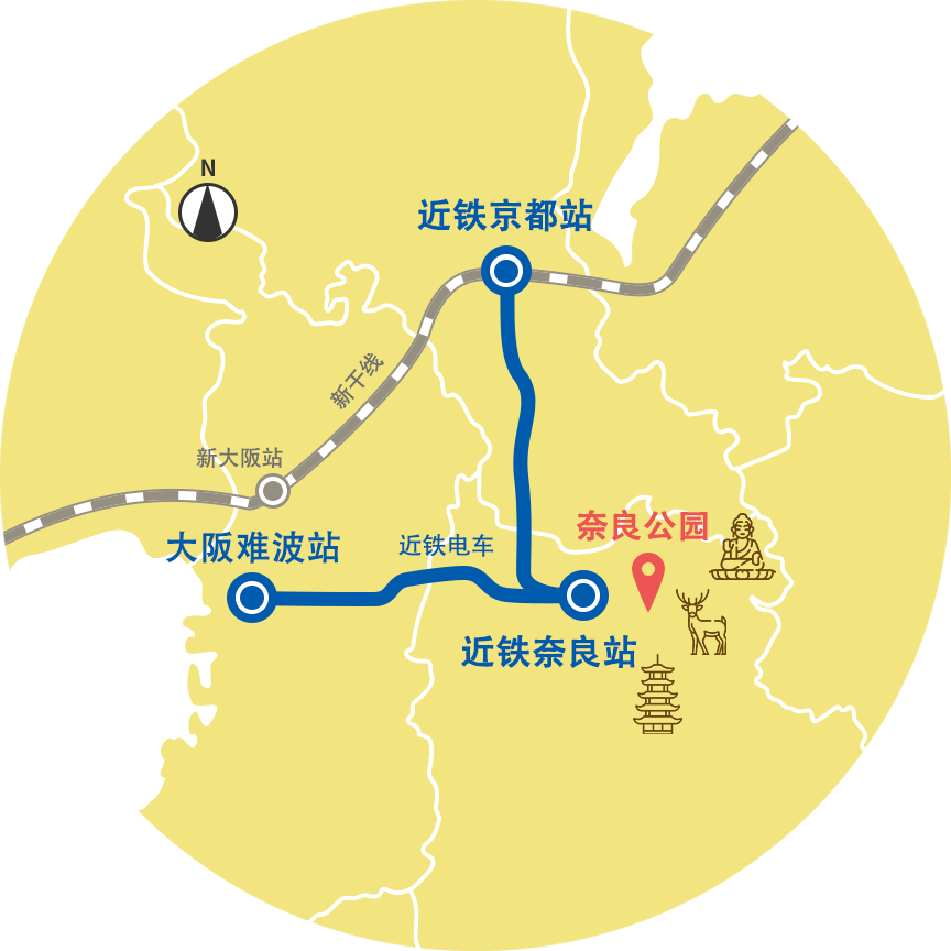 近铁电车从大阪(难波)及京都出发,可直达近铁奈良站,实现旅程的快捷。