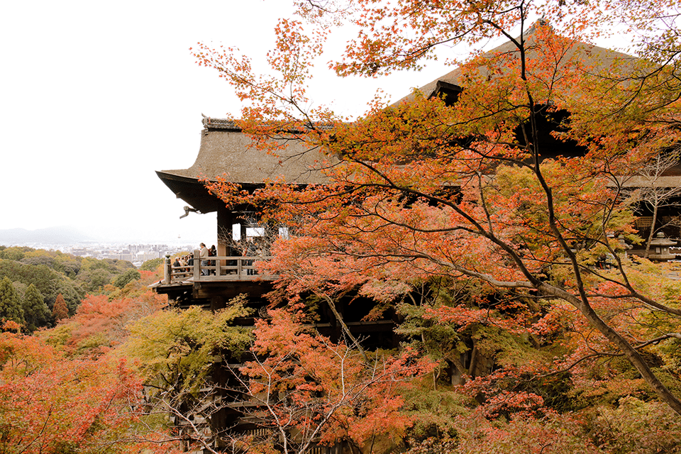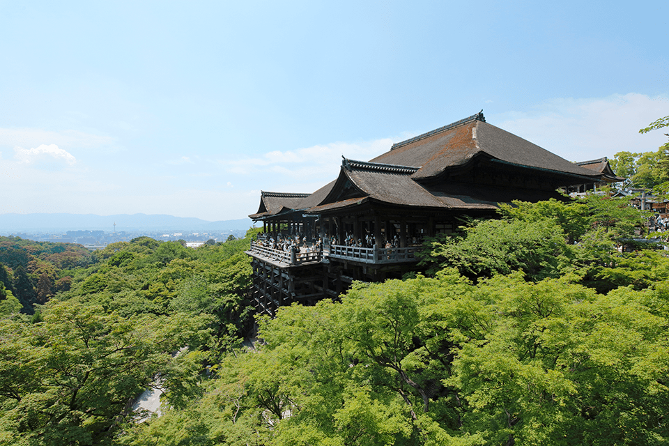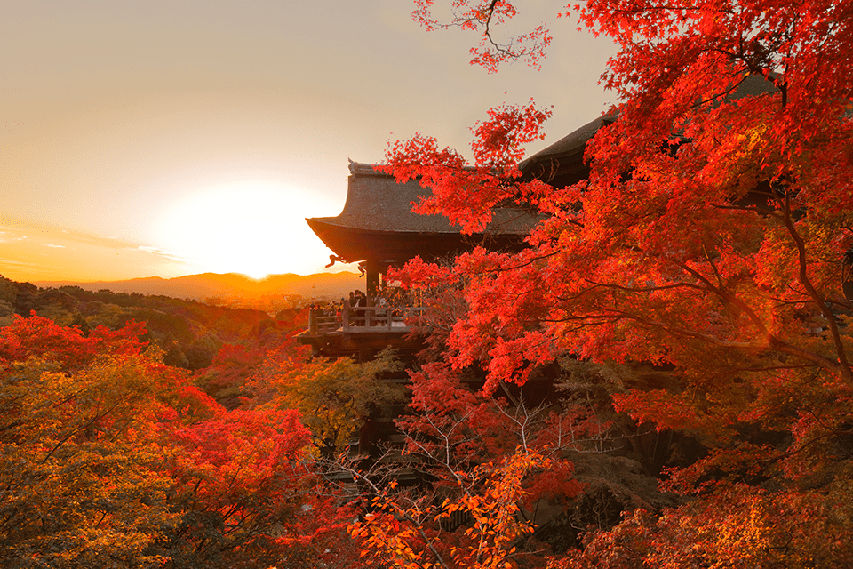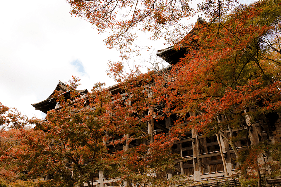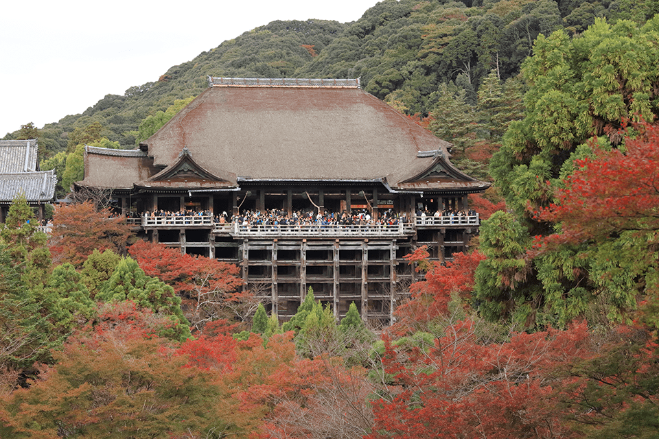 被指定为世界遗产,同时也代表京都精神的清水寺拥有约一千二百年的历史,是京都最引以傲的荣耀。清水寺的精彩之处数之不尽,其中最有名的就是巨大的木造舞台。舞台高达13公尺,能俯瞰山上的各类树木,是景色绝佳的地点。特别是当游客在秋季造访时,能见到红叶在夜幕降临后被灯光照亮所呈现的梦幻景致。