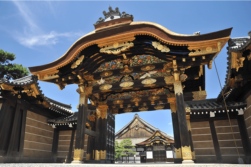 1603年由将军德川家康建设的二条城,是代表江户时代建筑的城堡,如果您是历史爱好家,就绝对应该到访此地。其中最精彩的是豪华绚丽的唐门(重要文化遗产),庆祝第15代将军重掌政权大厅,以及留存了狩野派屏风画的二之丸御殿(国宝)。城内出租包括英文在内的6种语言(日语,英语,汉语,韩语,法语,西班牙语)的语音指南,游客可通过它了解这一历史性重要旅游点的一切。此外,在这广大的用地上,有被指定为日本国家特别名胜的二之丸庭园等三个庭园。