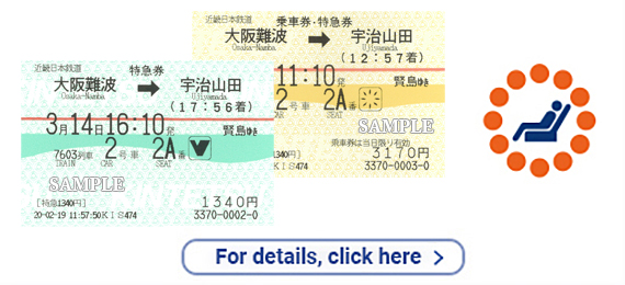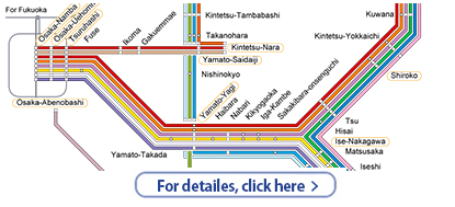 Kintetsu Limited Express trains link sightseeing areas in Osaka, Nara, Kyoto, Ise-Shima and Nagoya comfortably and conveniently. The Kintetsu Limited Express only has reserved seats. It provides you with a convenient means of arriving at your destination while comfortably and relaxingly sitting in your seat. To board a Limited Express train, you need to pay a Limited Express charge in addition to the basic fare. Be sure to purchase an additional Limited Express ticket.