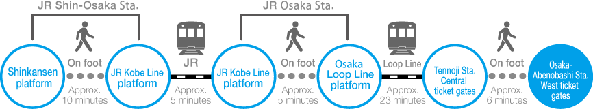 From the Shinkansen station to Osaka-Abenobashi Sta. on the KINTETSU Line