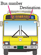 The bus destination is displayed at the front, back, and sides of the bus. Please check the bus number and its destination before boarding.