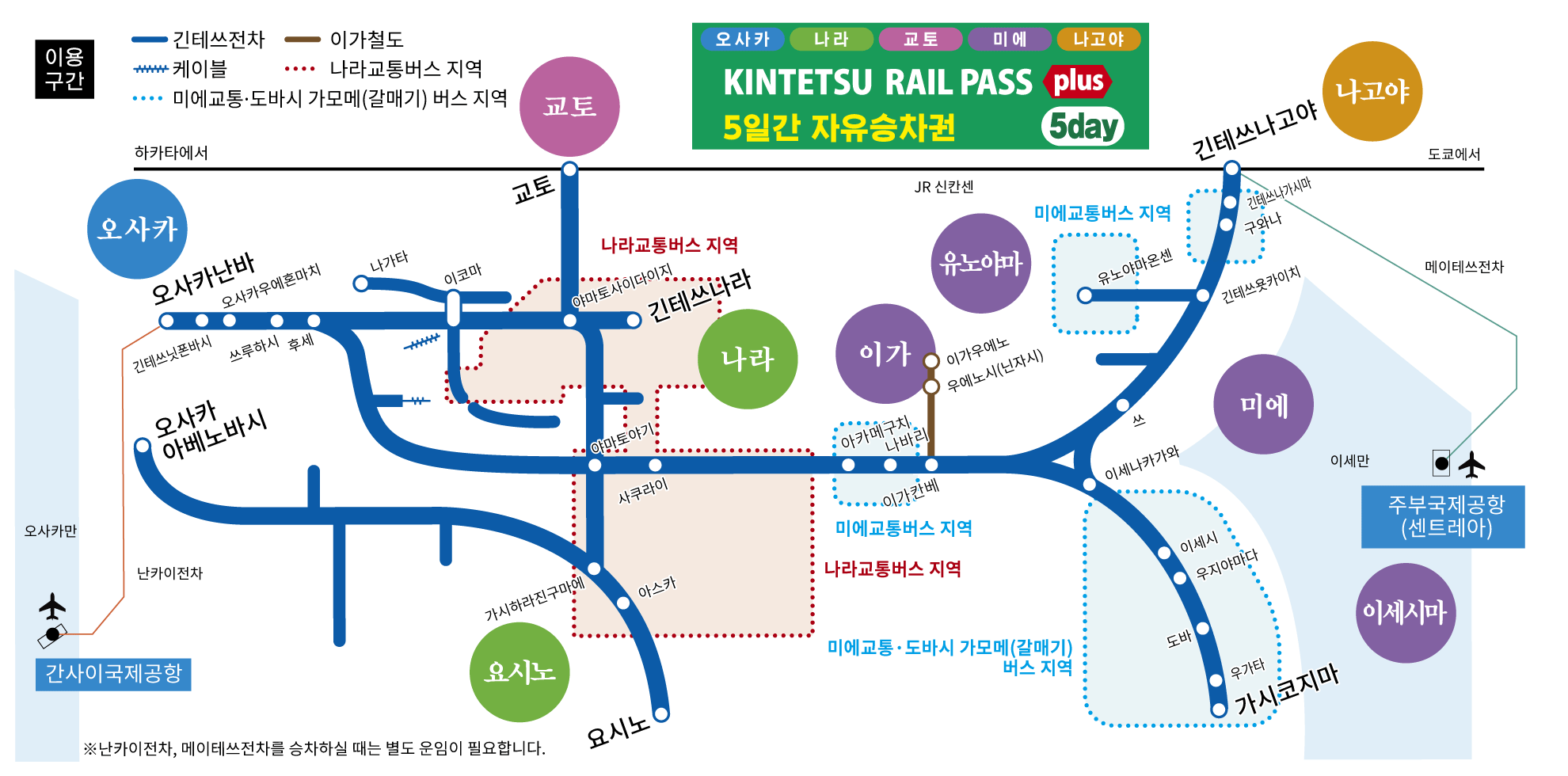 오사카, 나라, 교토, 나고야, 미에(이세시마)로 가는 저렴하고 편리한 디지털 티켓입니다.