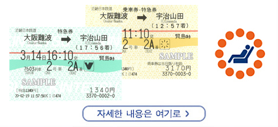 긴테쓰 특급은 오사카·나라·교토·이세시마·나고야의 관광지를 빠르게 쾌적하고 편리하게 연결합니다. 긴테쓰 특급은 전 좌석이 지정석입니다. 좌석에 앉아서 느긋하게 목적지를 여행하시는데 긴테쓰 특급이 편리합니다. 긴테쓰 특급을 승차하실 때는 승차 운임 이외에 특급요금을 지불하셔야 합니다.추가로 특급권을 구매하십시오.