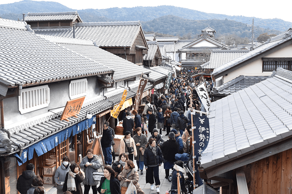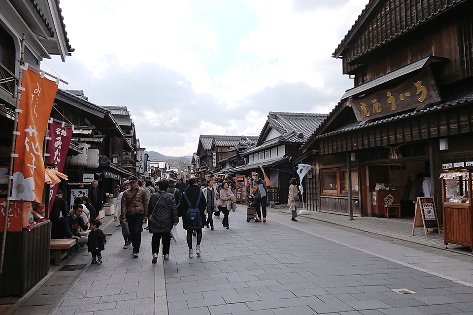 이세 신궁 내궁의 문전 마을인 오하라이 마을과 그 한가운데 있는 오카게 골목에서는, 에도~메이지 시대 이세지 참배길의 역사적인 거리 풍경을 즐길 수 있습니다. 50여 채의 멋진 가게가 늘어선 오카게 골목에서는, 미에 현의 풍부한 일품 요리와 이세의 전통 문화를 경험할 수 있고, 북이나 그림 연극도 즐길 수 있습니다. 돌아가기 전에 이세 명물 '아카후쿠' 를 꼭 맛보십시오.