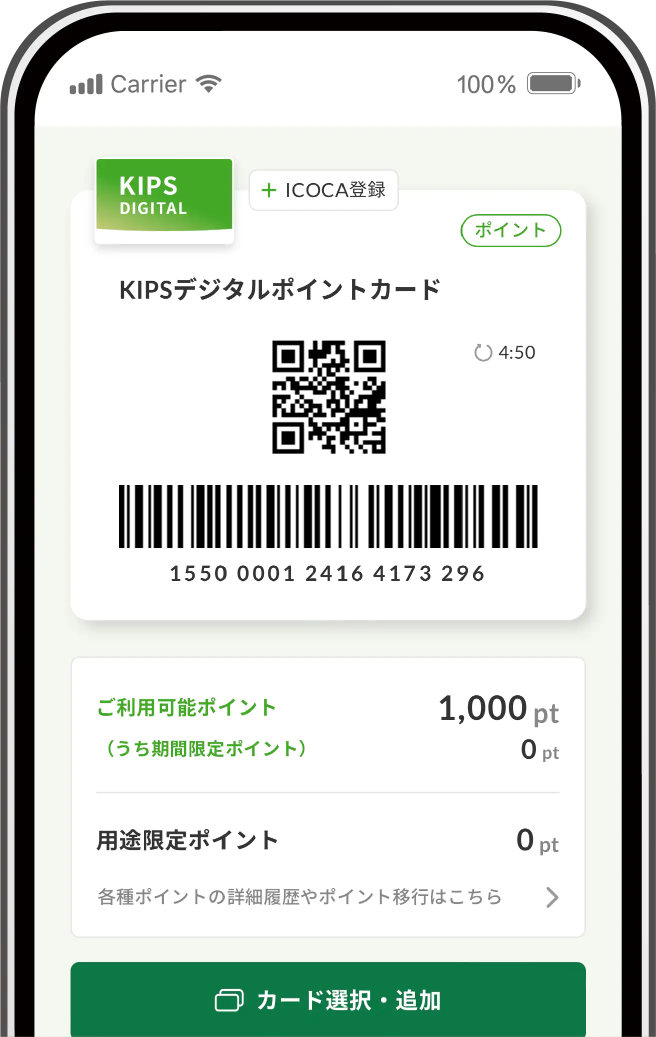 KIPSアプリをダウンロードすると「KIPSデジタルポイントカード」という気軽で便利な現金専用カードをゲット!スマホだけで手軽にお買物をお楽しみいただけるほか、ポイントの履歴や残高も簡単にご確認いただけます。