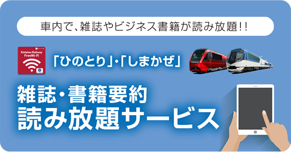 「ひのとり」・「しまかぜ」の車内でお手持ちのモバイル端末から週刊誌や旅行ガイド、ビジネス書籍(要約)などを無料でお楽しみいただけるサービスです。