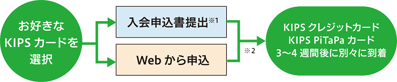 - KIPS PiTaPaは、駅備え付けの入会申込書にご記入のうえ、郵送にてお申し込みください。 入会申込書郵送後、審査を経たうえで、約3~4週間後にカードが自宅に送付されます。