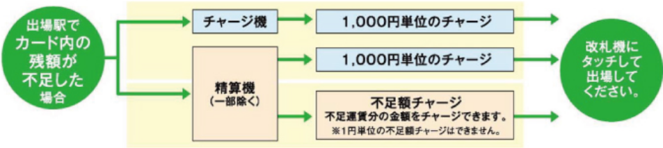 出場駅でカード内の残額が不足となった場合は、精算機等でチャージ後に、改札機にタッチしてください。