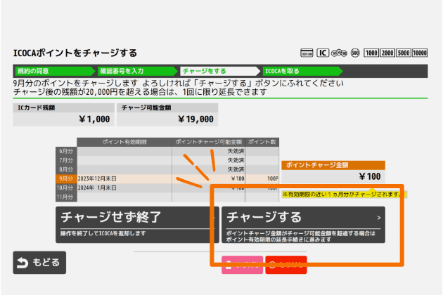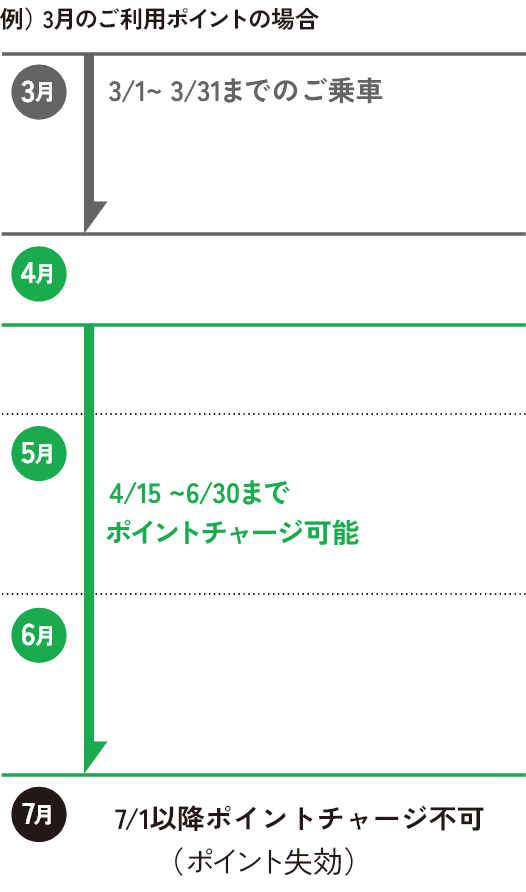 ポイントチャージはご乗車の翌月15日から可能となり、付与月当月を含み3カ月後の末日が有効期限となりますので、有効期限までにチャージのご操作をお願いします