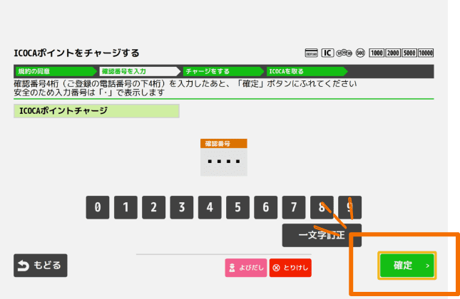 規約に同意後、確認番号(ご登録電話番号の下4桁)を入力し、「確定」を押す