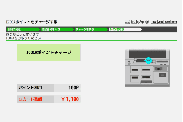 お手持ちのICOCAをトレイに置き「ICOCAポイントをチャージする」を選択
