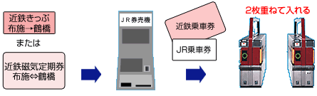 近鉄とJRの乗車券を2枚重ねて自動改札機に入れてください。 回数券カードで乗り継がれる場合も、JRの乗車券と2枚重ねて自動改札機に入れてください。