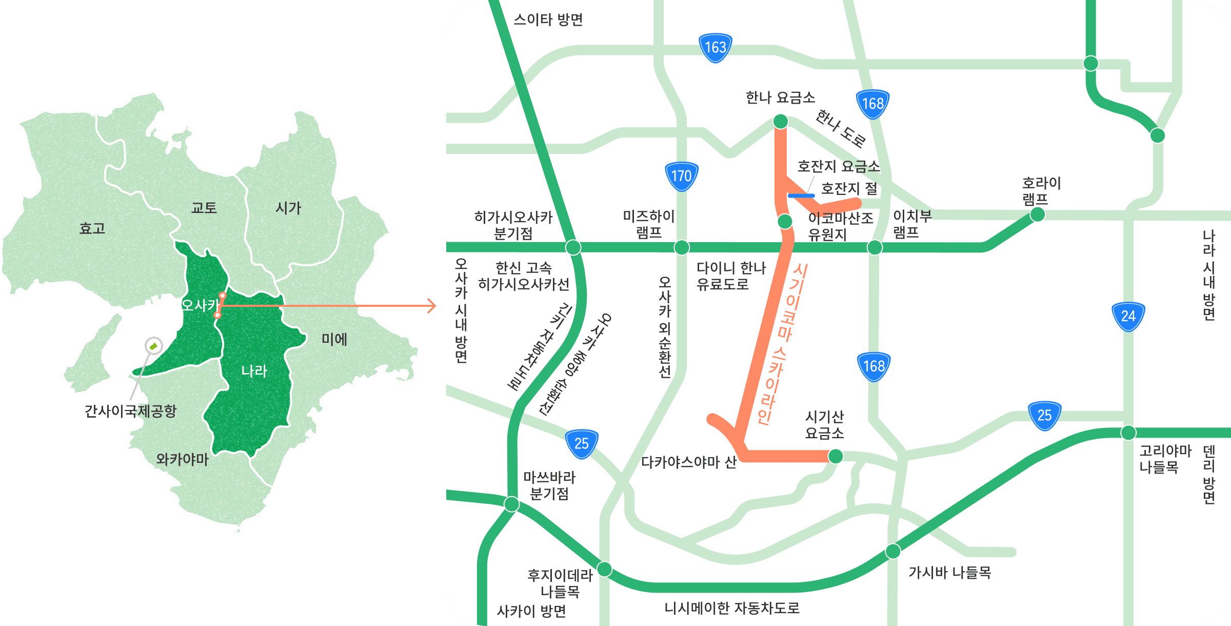 나라 시내에서 약 25~30분, 오사카 시내에서는 고속도로를 이용하면 약 30분 걸립니다."