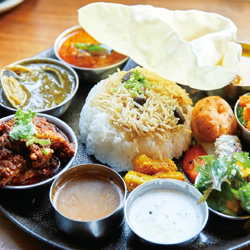 南インドで修業を積んだオーナーによる本格スパイスカレーが名物。南・北インドそれぞれの特徴をミックスした、ターリー(定食)スタイルのカレー4種+本日のおかず2,500円。サラダや炒め物も付いて大満足!