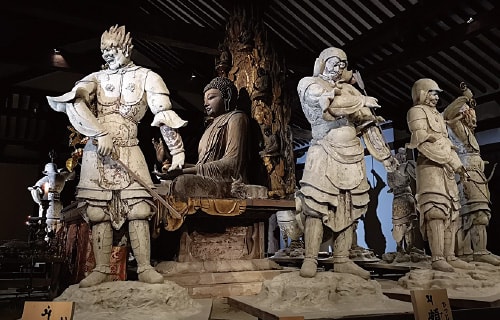 747年に建立、本尊は病気平癒に御利益がある薬師如来。その周りで円陣を組む、護衛役の国宝・十二神将立像が圧巻! 憤怒の表情をたたえた伐折羅(バザラ)大将は特に有名。十二神将が描かれたお守り干支各500円