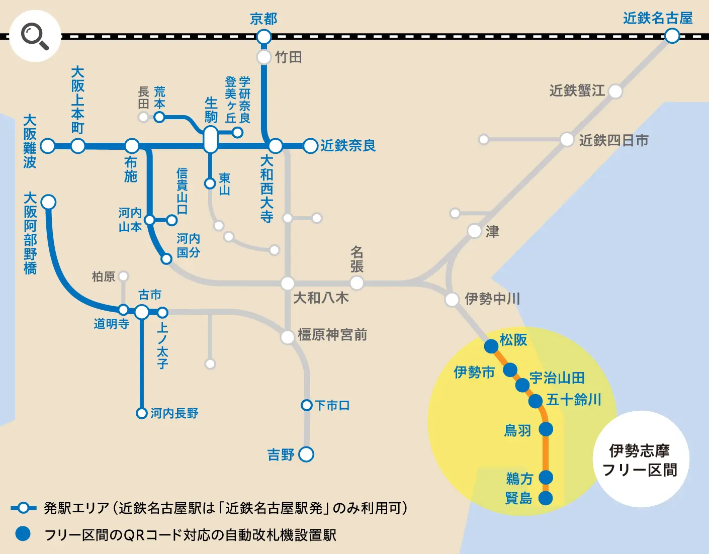 <関西発>は関西発の発駅エリアとフリー区間(松阪駅~賢島駅)内、<近鉄名古屋駅発>は近鉄名古屋駅とフリー区間(松阪駅~賢島駅)内のみ取扱いいたします。