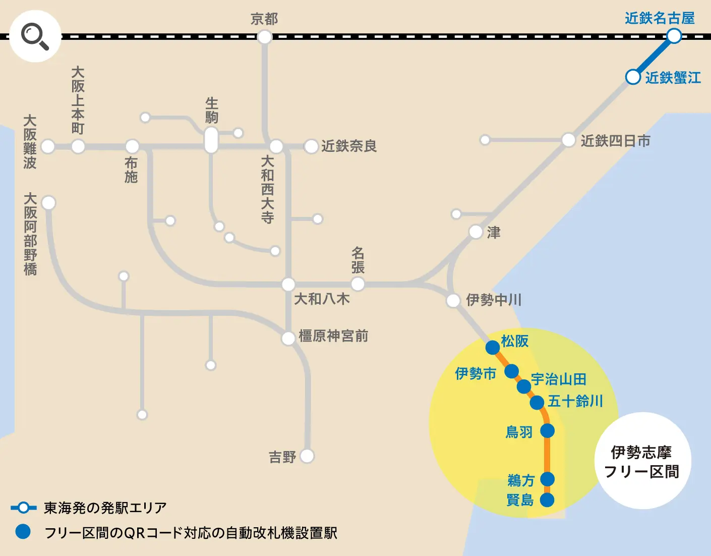 <関西発>は関西発の発駅エリアとフリー区間(松阪駅~賢島駅)内、