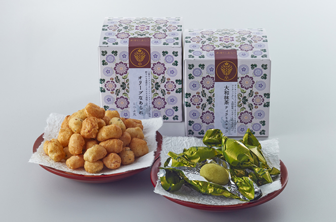 (オリーブなあられこつぶ丸・大和抹茶ティラミスチョコレート)※夏季は大和抹茶ティラミスチョコレートを黒米紅葉ふきよせに変更します。