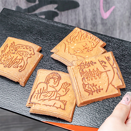 奈良らしさたっぷりの瓦せんべいは、鹿の他にも、大仏、五重塔、バサラが描かれている。季節によって絵柄が変わるのも楽しみのひとつ。