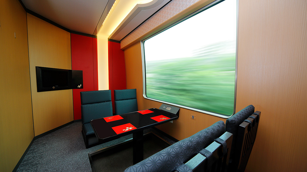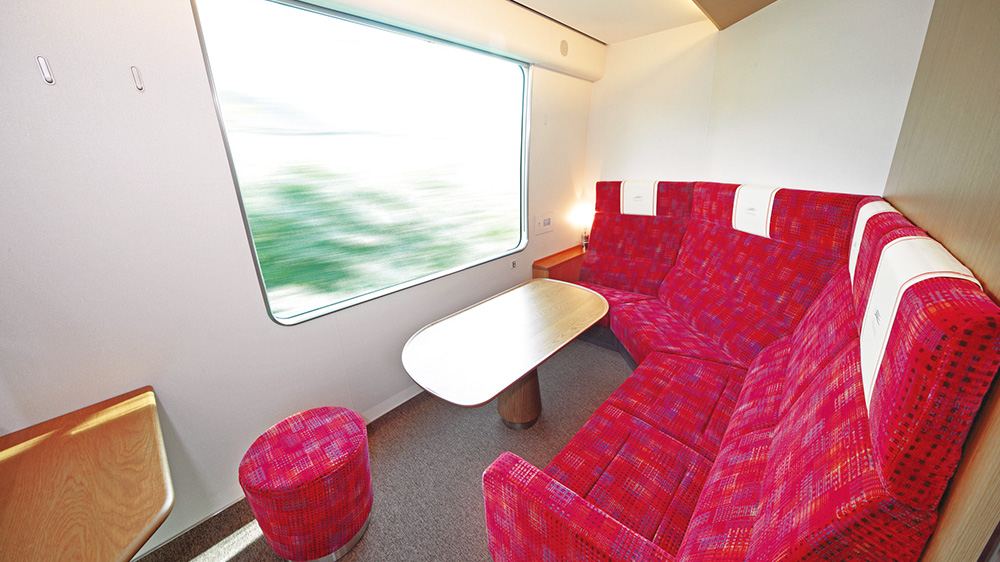 セミコンパートメント型で、グループでのご旅行を楽しめる大型テーブルを備えたサロン席を3箇所設けています。通路側には仕切板を設置し、プライベート感を高めました。