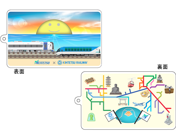 近鉄50000系「しまかぜ」、名鉄2000系「ミュースカイ」および両社の路線図をデザイン。
