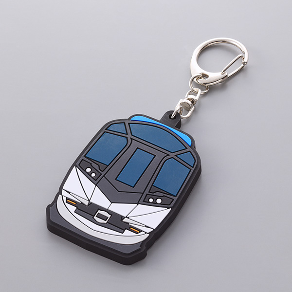 「しまかぜ」の車両と10周年記念ロゴをデザインしたラバーキーホルダーです。